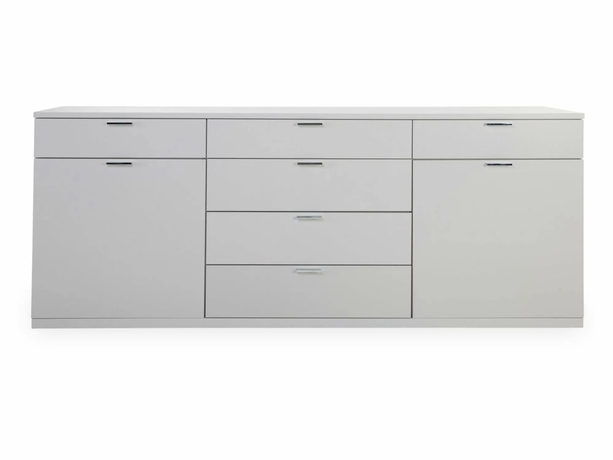 Korpus: Lack grau, Front: Lack grau, Griff Chrom glänzend, Türen und Schübe gedämpft, mit 2 Türen und 6 Schubkästen, Beleuchtung und Zubehör auf Wunsch