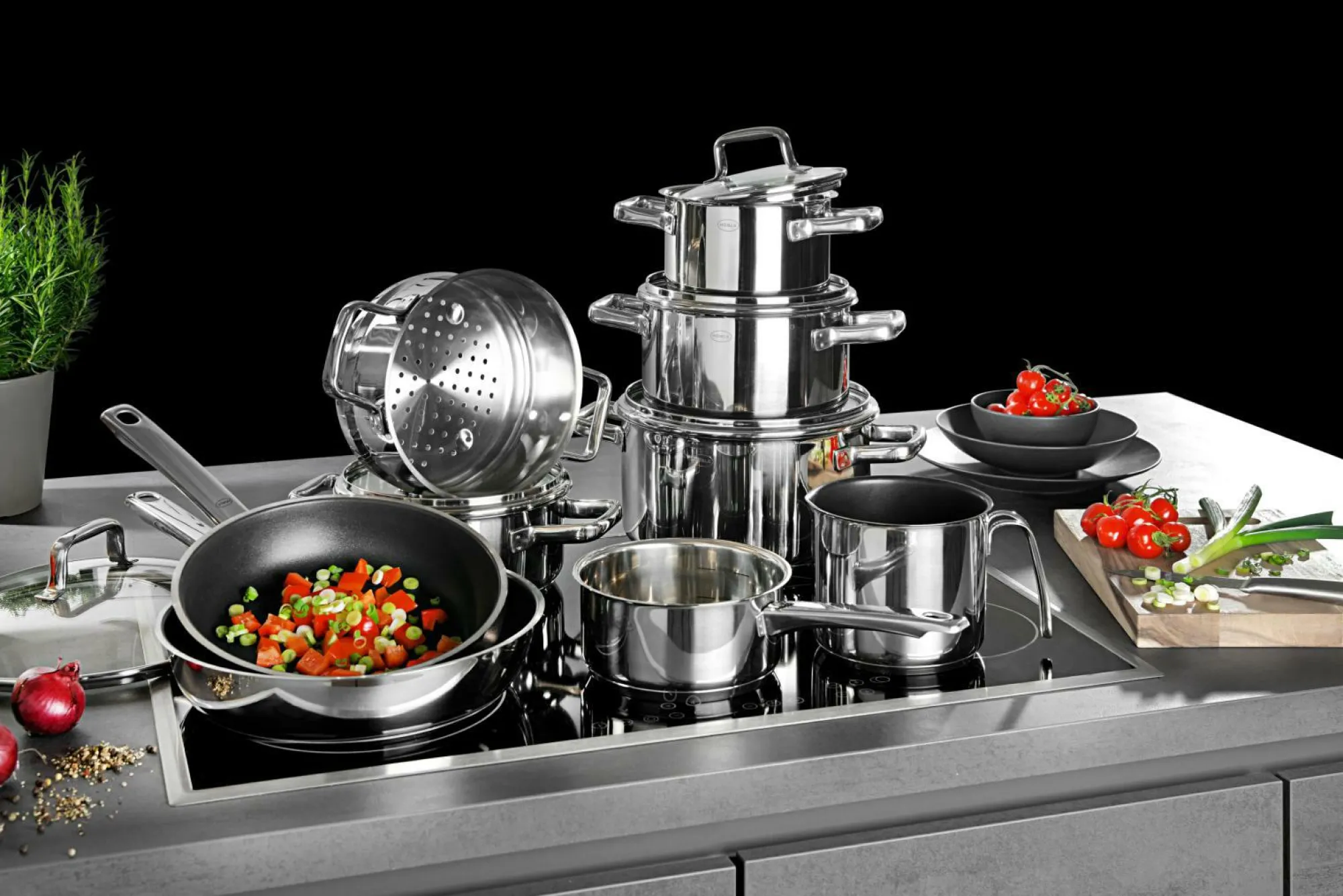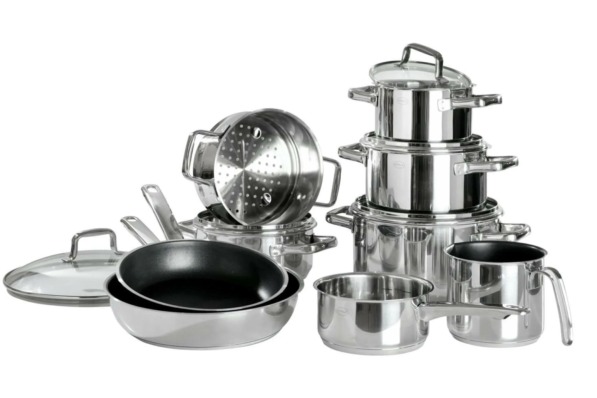 · bestehend aus: Stielkasserolle 16 cm Kochtopf 16/20/24 cm mit Deckel Bratentopf 20 cm mit Deckel Milchtopf 14 cm Dämpfeinsatz 20 cm Glasdeckel 28 cm Bratpfanne 24/28 cm