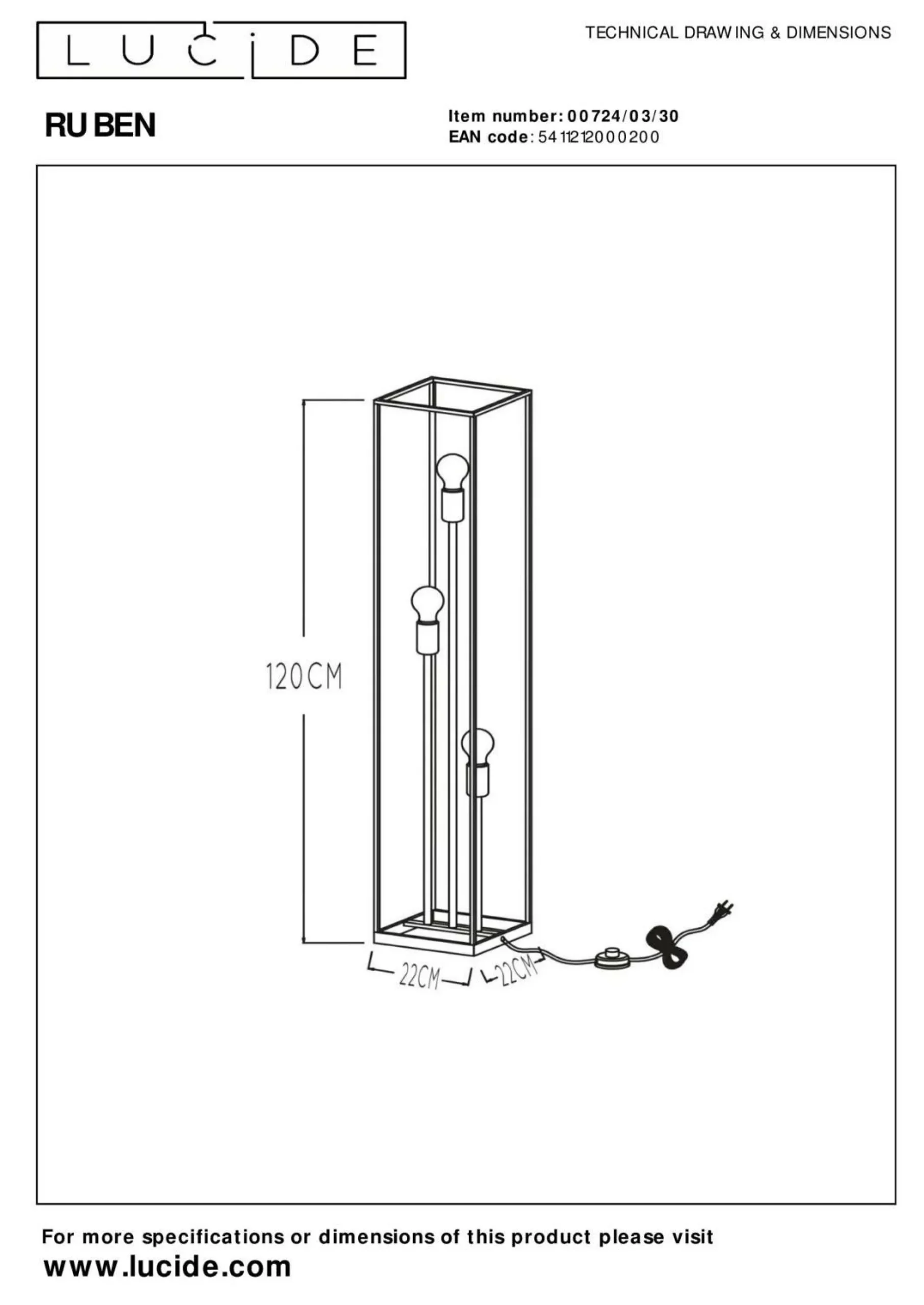 Mit der Stehlampe RUBEN liegen Sie immer voll und ganz im Trend. Sie können bei dieser Stehlampe auf bewährte Markenqualität von LUCiDE bauen. Das hervorragende Design ermöglicht viele Einsatz- und Kombinationsmöglichkeiten und lässt sich problemlos in Ihre Zimmer einfügen. Das Modell RUBEN besitzt ein Längenmaß von 22 cm, eine Breite von 22 cm sowie eine Gesamthöhe von 120 cm. Es weist eine E27-Fassung auf. Die Stehlampe wird sich hervorragend in jeden Einrichtungsstil integrieren und erschafft ein tolles Flair. Metall kommt bei der Herstellung zum Einsatz. Ihr Interieur wird aufgrund der Lampe gezielt ergänzt. Tauchen Sie Ihr Zuhause mit dieser Leuchte in angenehmes Wohlfühllicht.