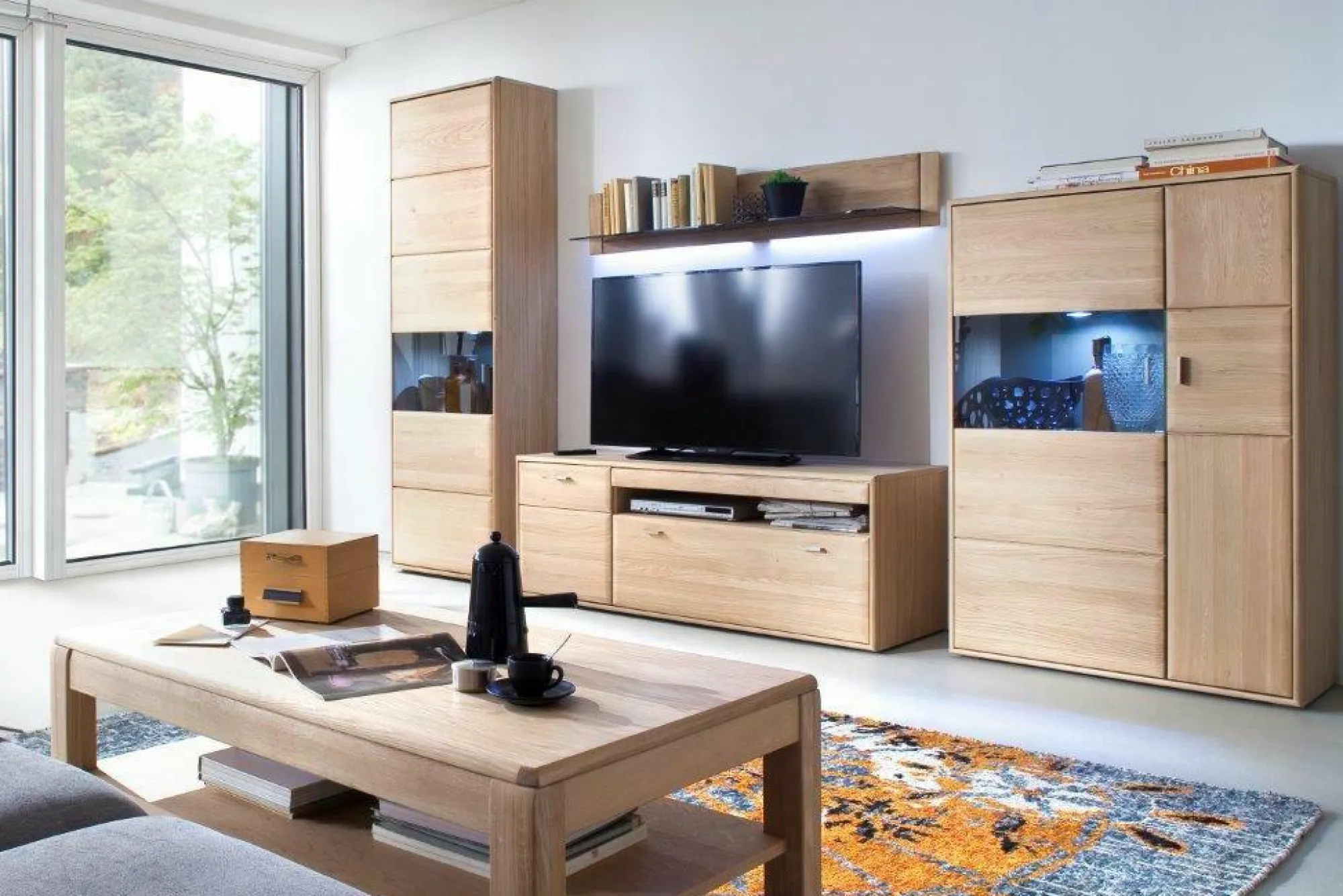 Front: Eiche Bianco massiv geölt Korpus: außen Eiche Bianco furniert / innen Eiche Bianco Nachbildung Glas in Parsol grau Rückwand hinter Glas: taupefarbig Dekor Schubkästen und Glastüren gedämpft Wohnwand best. aus: Vitrine, Lowboard, Highboard und Wandboard >>> Preis ohne Beleuchtung <<>> Maße ca. Montagemaße <<<