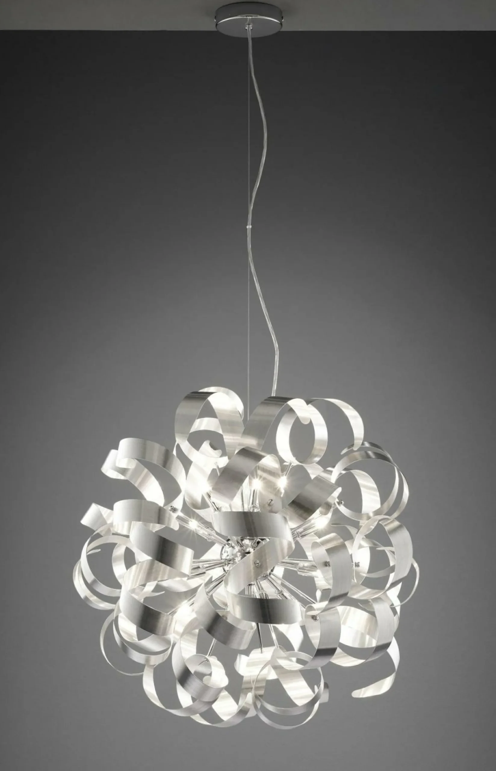 Wunderschönes und außergewöhnliches Design verkörpert diese Pendelleuchte von MONDO. Durch die elegante Form kommt die Lampe perfekt über einem schönen Esstisch zur Geltung und wird Ihnen dort angenehmes Licht spenden. Aus Aluminium gefertigt, erscheint die Pendelleuchte in der Farbe Chrom, die den edlen Stil weiterhin unterstützt. Insgesamt besitzt die Leuchte einen Durchmesser von 60 cm und ist 180 cm hoch. Besonders vorteilhaft: Diese Lampe besitzt eine Dimmfunktion, wodurch Sie die Lichtstärke ganz individuell bestimmen können – einfach toll!
