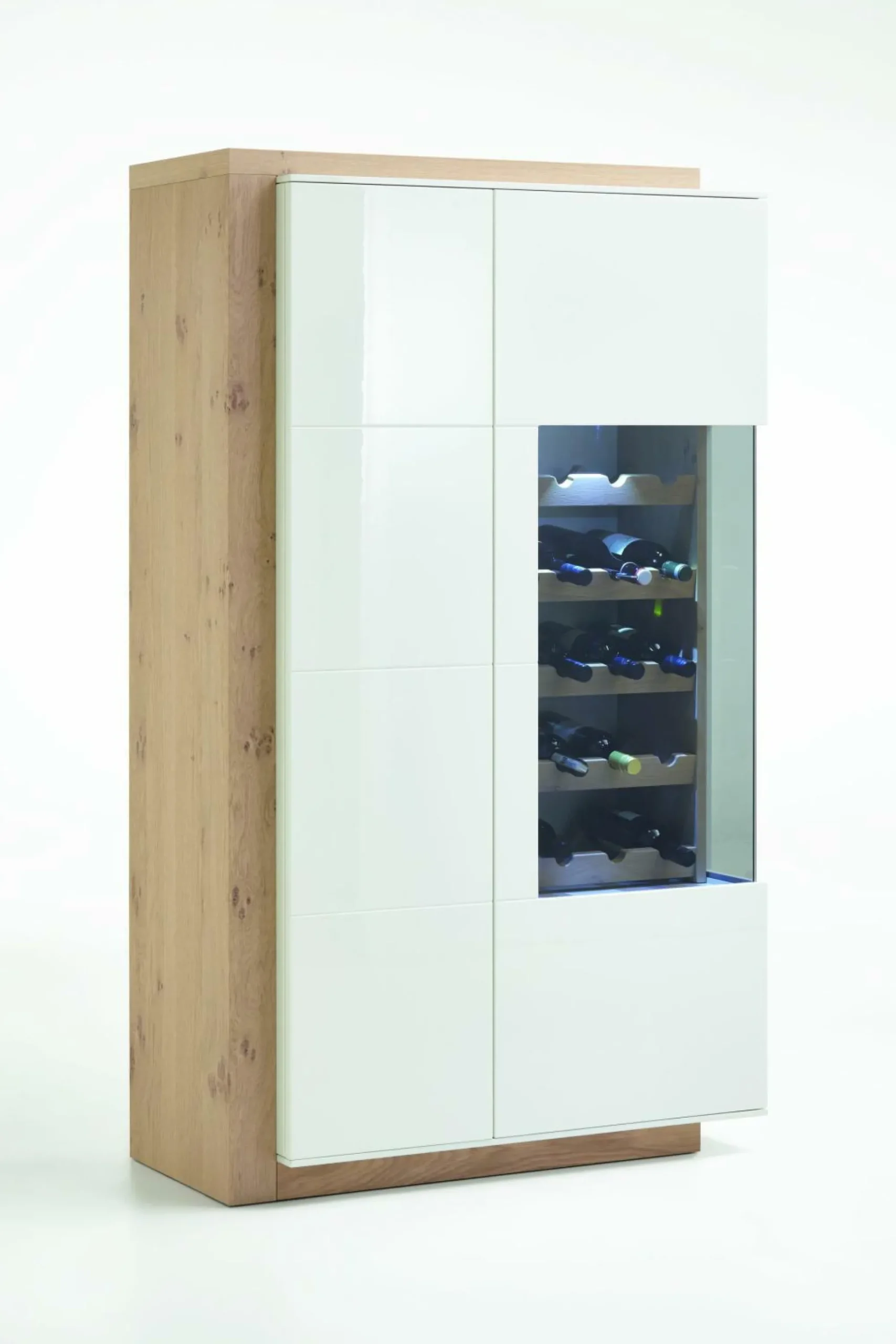 Front und Korpus in Lack Hochglanz weiß Rahmen: Eiche astig CG01 Türen mit Slow-Motion Funktion 1 Holztür links, 1 Holz-/Glastür rechts >>> Preis ohne Beleuchtung/Zubehör <<>> Preis ohne Weinregal <<<