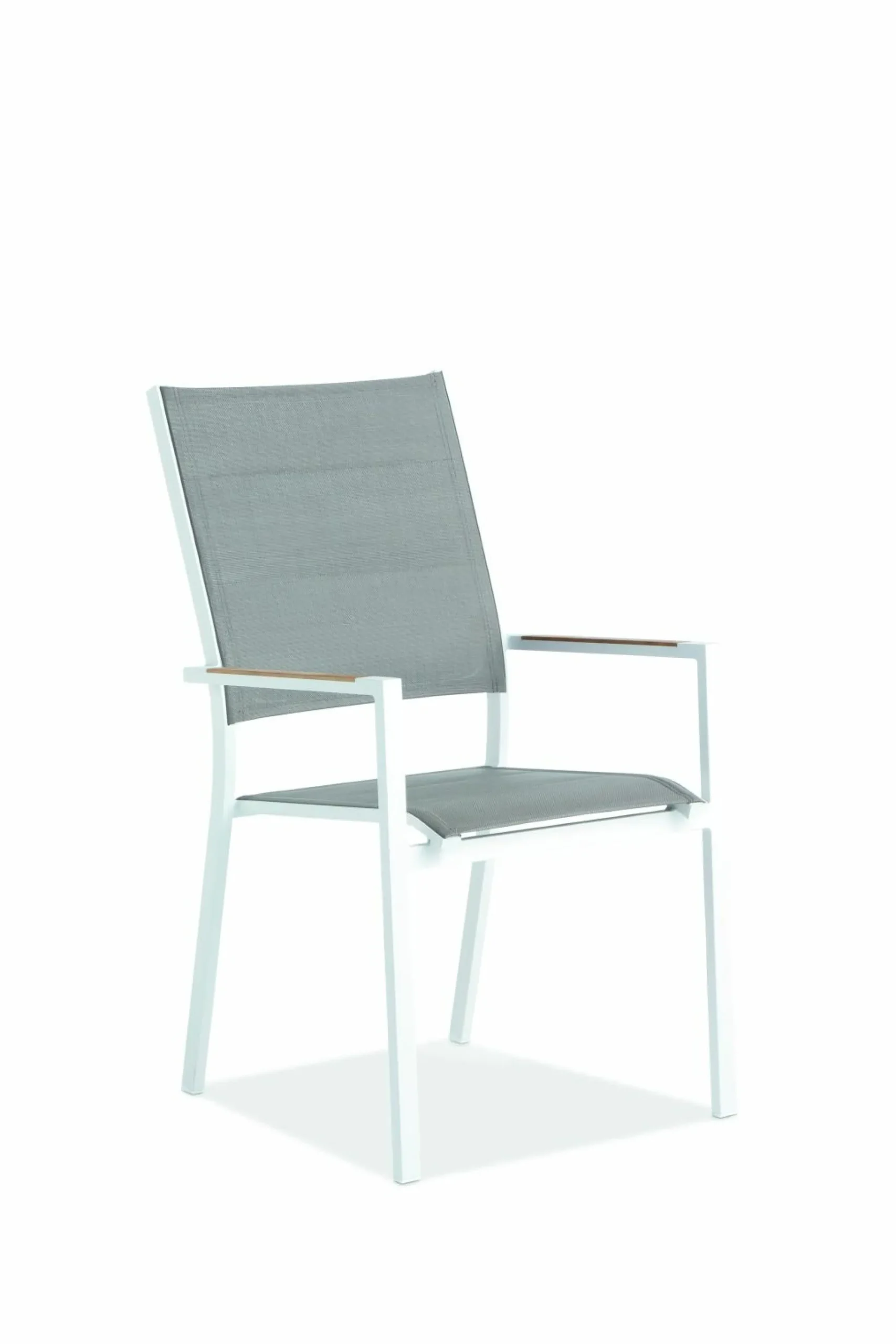 · Hochlehner NANTES Sitz und Rücken Textilen taupe, Armlehnauflagen Teak natur, Gestell Aluminium pulverbeschichtet, Farbton weiss, stapelbar, 56×64 / 95 cm