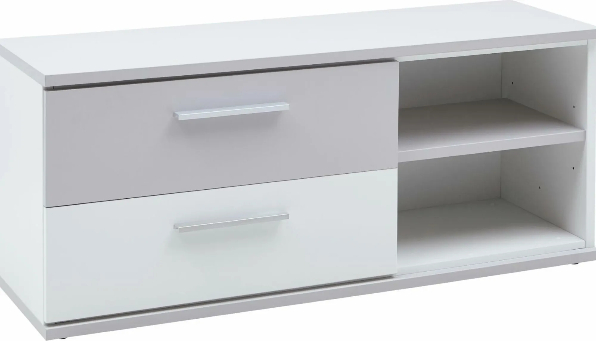 Das moderne Sideboard New York der Friedrich Priess GmbH amp Co. KG überzeugt mit einem modernen Design. Das Sideboard erscheint in einem trendigen Weiß, dass in einem angenehmen Kontrast zu dem Sandgrau (Schubkasten oben) steht. Die Kommode besteht aus Dekor Holz.