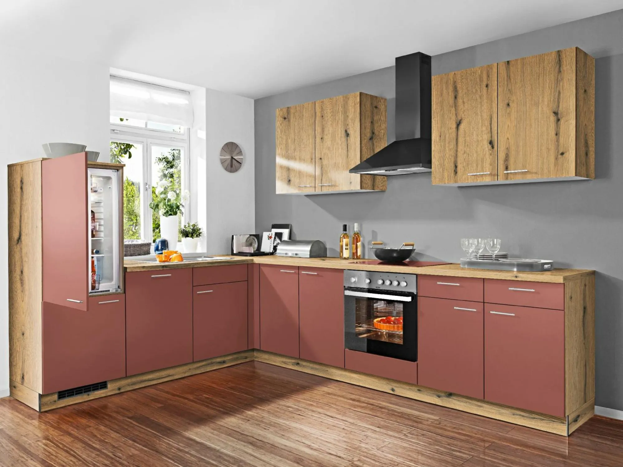 Front: Karminrot Zu der Küche gehören folgende E-Geräte: PREMIERE: Backofen: 0981270, EEK:A, 225063 PREMIERE: Kochfeld Glaskeramik PREMIERE: Dunstabzugshaube: 0236236, EEK:A 3728673 PREMIERE: Kühlschrank: 0562444, EEK:F, 361726 AUF WUNSCH GEGEN MEHRPREIS: Nischenausstattung und Zubehör Geschirrspüler