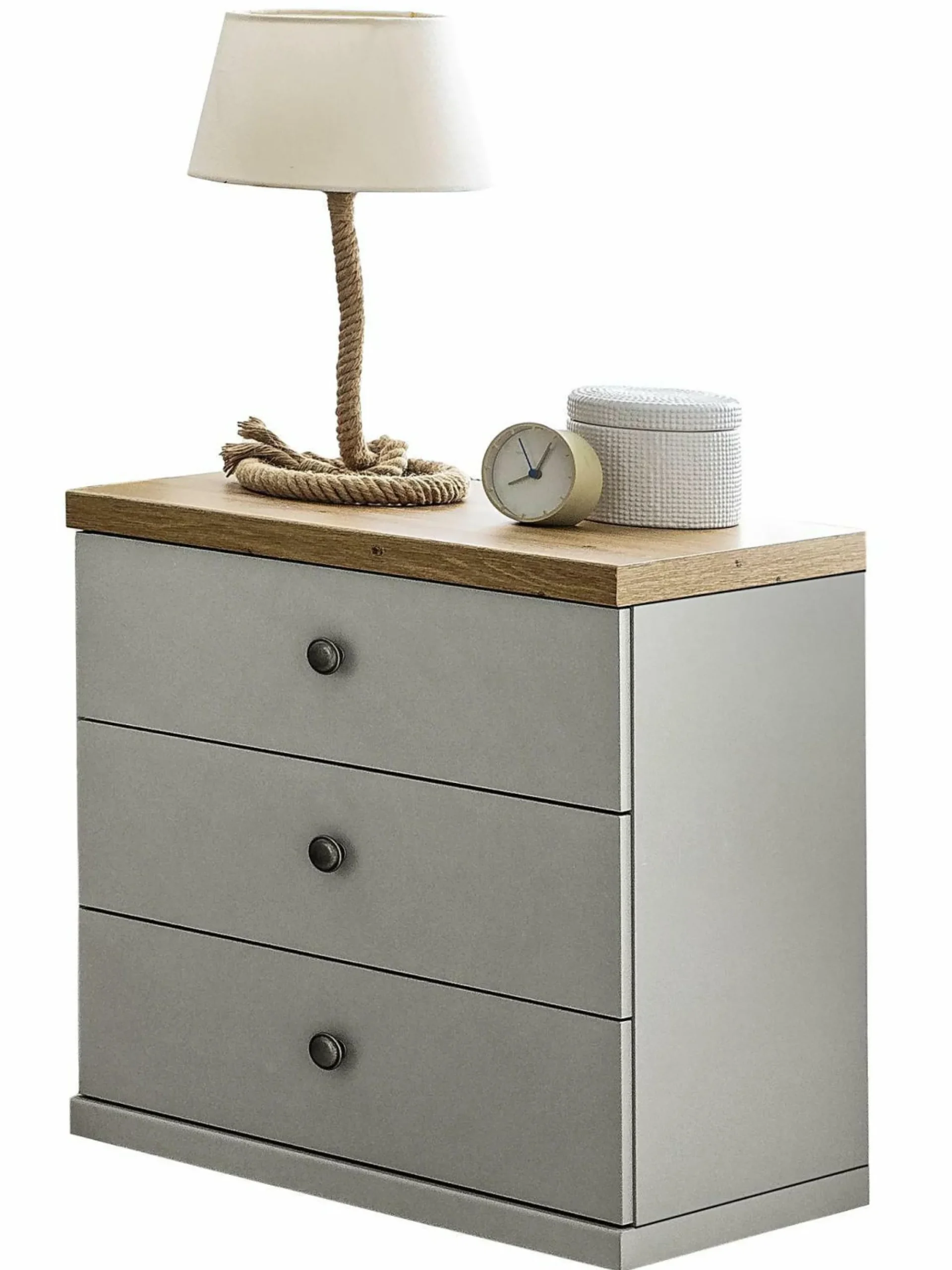 Die Nachtkommode AALBORG von SANSIBAR ist nicht nur eine praktische Aufbewahrungsmöglichkeit, sondern sie punktet auch mit einzigartigem Design. Der Korpus und die Front strahlen in einem modernen Kieselgrau. Die Deckplatte überzeugt mit einem Bianco Eichen Dekor und erzeugt so eine gemütliche Atmosphäre. Dank der drei großzügigen Schubladen bietet sie ausreichend Platz für Ihre persönlichen Gegenstände und verleiht Ihrem Schlafzimmer einen Hauch von Raffinesse. Entdecken Sie jetzt die gesamte Schlafzimmerkollektion AALBORG von SANSIBAR, die viele Facetten und ihren ganz eigenen Charme hat.
