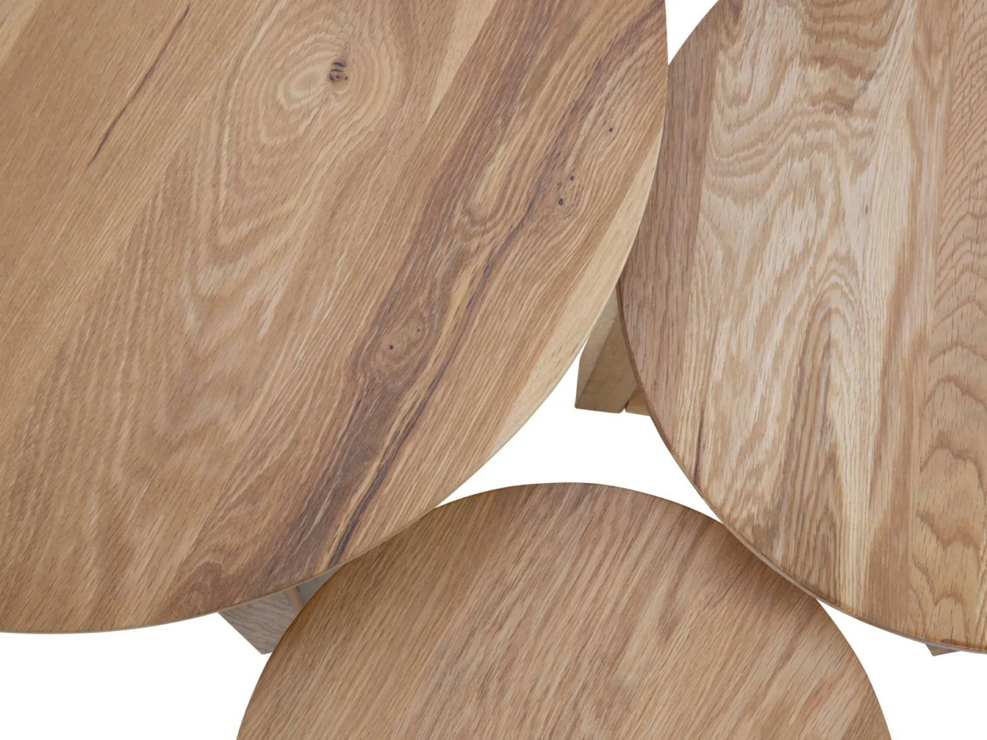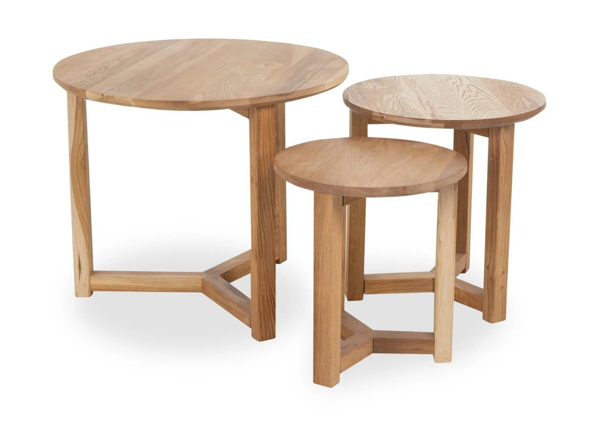 Das 3-teilige Couchtisch-Set Faye ist eine nützliche Ergänzung im Wohnbereich. Aus hellem Massivholz gefertigt, besitzen alle drei Tische ein ganz besonderes Gestell und dazu eine runde Tischplatte. Durch Form und Farbe entsteht ein sehr schöner Landhausstil, der aber auch in modernen Einrichtungen wunderbar zur Geltung kommt. Ob einzeln oder getrennt aufgestellt – auf den drei verschieden großen Couchtischen können Sie Getränke, Snacks, Zeitungen etc. schnell ablegen und auch für kleinere Dekorationsgegenstände ist hier Platz.
