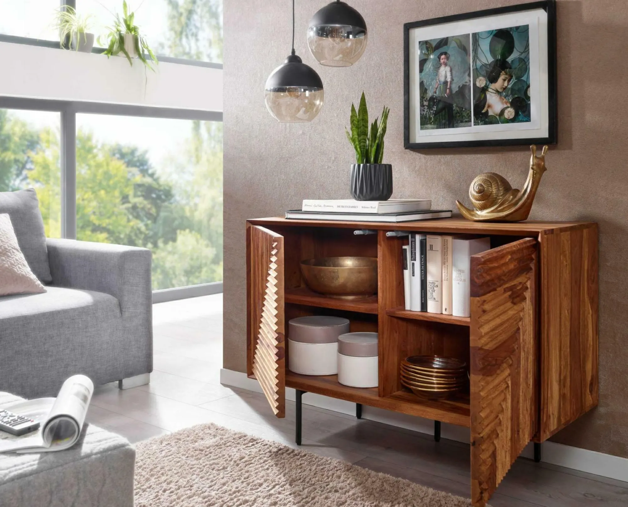 · Lieferumfang – Ein Sideboard ohne Dekoration. Montagematerial und -anleitung liegen der Lieferung bei.