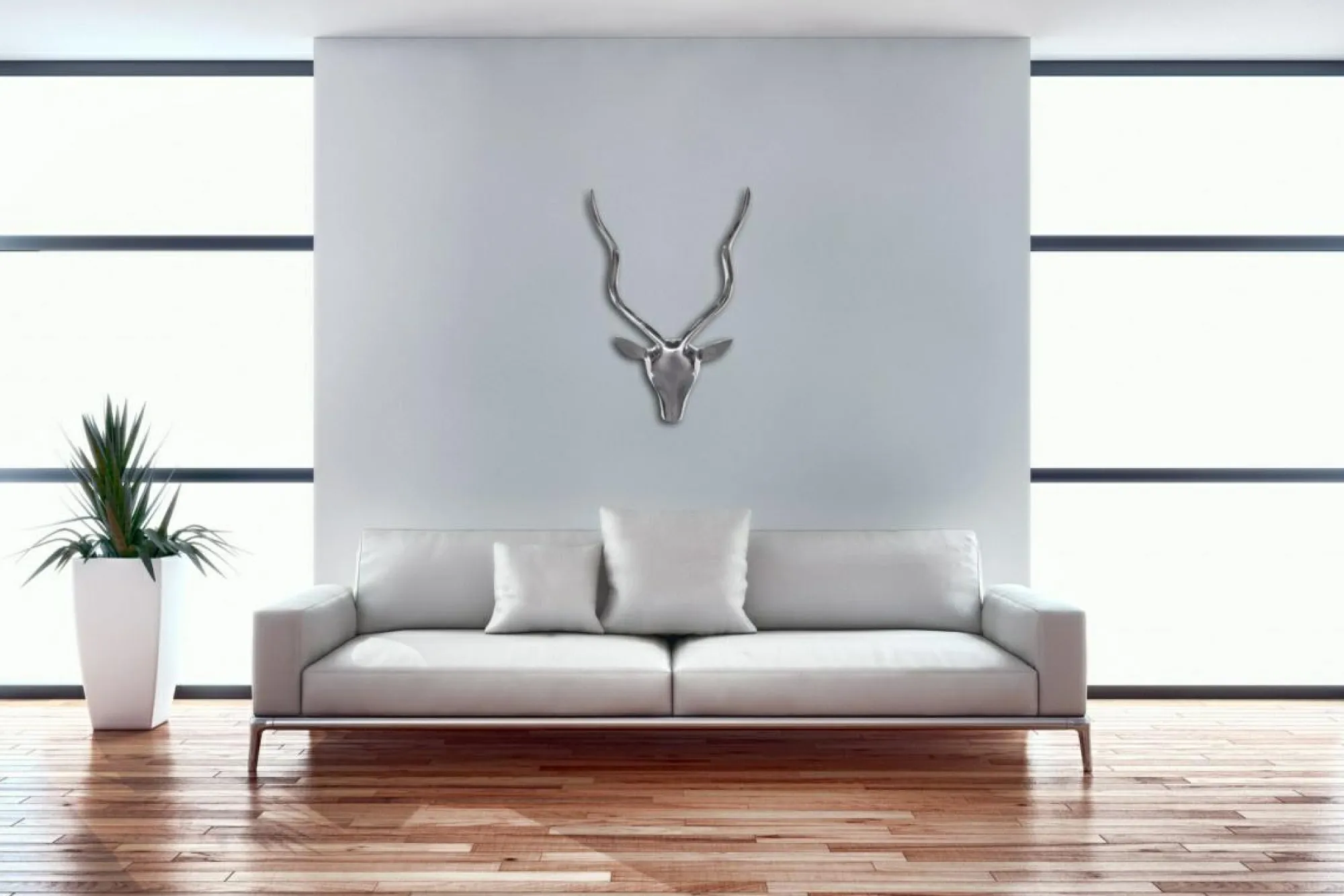 · Abstrakt – Durch die besondere Formgebung der Wanddekoration entsteht die Kontur eines Hirschkopfes.
