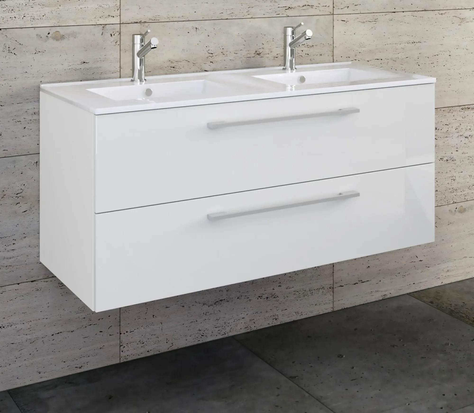 · Als Eyecatcher dient das moderne Doppelwaschbecken aus massiver Keramik, das Ihrem Badezimmer ein ganz besonderes Ambiente verleiht